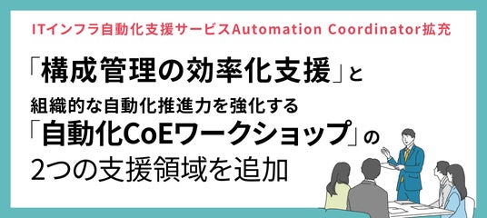 「構成管理の効率化支援」は、煩雑になりがちな構成管理の課題解決を、また、「自動化CoEワークショップ」は、組織的な自動化推進力の強化を目的としたサービスです。どちらも、既存の利用企業から高い満足度を得ており、これを受けての追加となります。