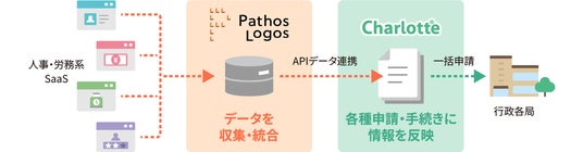 PathosLogosは人事領域に特化した複数のSaaSを接続・統合することで、分散した人事データを一元管理できる「HR共創プラットフォーム」です。一方、Charlotteは、社会保険・税務関連の電子申請に強みをもつクラウドサービスとして、多様な人事給与データを活用した効率的な申請業務を実現してきました。今回の連携により、PathosLogosが統合した人事データを、Charlotteに直接連携することが可能となります。