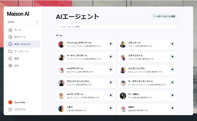 AIに特定の職種を設定することで前提知識が必要な質問でも、より精度の高い回答を得ることが出来ます。ファッション業界に特化した「Maison AI」では、人事や法務だけでなく、ファッションデザイナーやパタンナーのAIエージェントも用意しています。