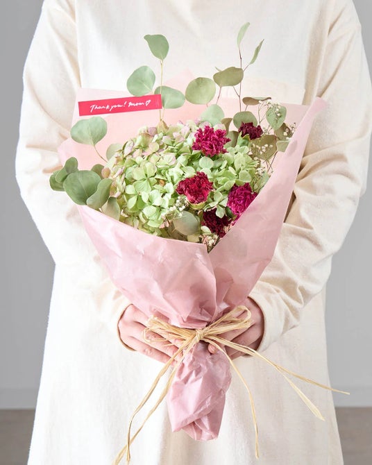 母の日のギフト選びに自信がない方も安心。ラッピング付きで迷わず贈れる、母の日カラーのドライフラワーブーケです。主役は、母の日の定番・カーネーション。紫陽花とカスミソウ、ユーカリを添えて、淡いトーンでまとめました。