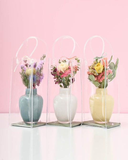 ドライフラワーと小さな花びんのセットを、透明のバッグにお入れしたひと品。 基本は中身を取り出してお飾りいただく仕様ですが、バッグに入れたままでもお楽しみいただけます。お母さんの好みに合わせて選べる、三つのカラーをご用意しました。バッグには、リボンと母の日のタグを付けてお届けします。