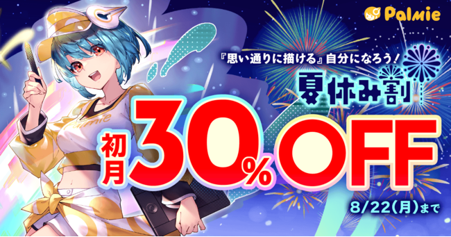株式会社パルミー(所在地:東京都港区、代表取締役:伊藤貴広、以下パルミー)は、本日2022年8月8日(月) 12時00分から2022年8月22日(月) 23時59分までの期間、受講料が初月30%OFFになる『夏休み割』を開催いたします。また、学生限定でAmazonギフト券を最大5,000円分をプレゼントする『学生応援キャンペーン』も開催中!夏休みはパルミーでイラストを学びませんか?