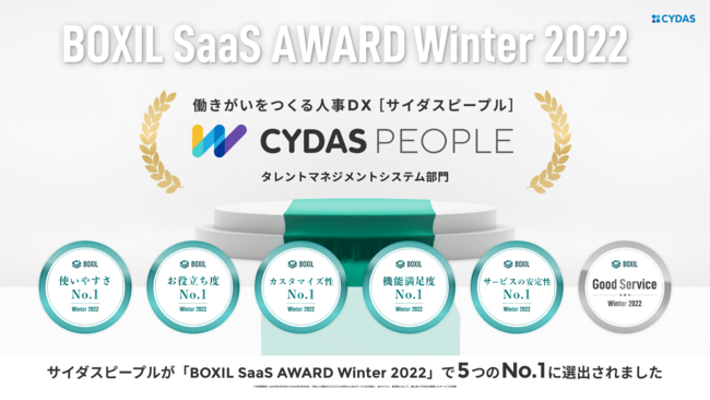 「CYDAS PEOPLE」は、「BOXIL SaaS AWARD Winter 2022」(※1)タレントマネジメントシステム部門で「Good Service」(※2)の称号のほか、「使いやすさNo.1」「お役立ち度No.1」「カスタマイズ性No.1」「機能満足度No.1」「サービスの安定性No.1」(※3)の5つのNo.1に選ばれました。