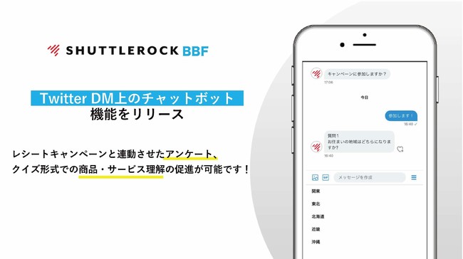 シャトルロックジャパン株式会社(本社:東京都新宿区、代表取締役:金光展意、以下、シャトルロックジャパン)は、シャトルロックジャパンが運営するTwitterインスタントウィンツール「Shuttlerock BBF」にて、チャットボット機能をリリースしたことをお知らせいたします。これにより、Twitter DM(ダイレクトメッセージ)内で応募が完結するレシートキャンペーンの参加者にアンケートを実施することが可能になりました。