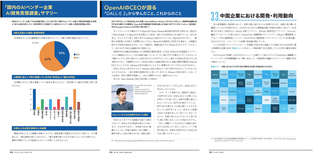 デジタルツイン、責任あるAI、インフラ、防災、防犯、ものづくりなど、国内企業の取り組みを紹介。国内のAIベンダー企業に、AI開発の実態調査を実施しました。中国企業における開発・利用動向、メタバースゲームThe Sandboxへのインタビューも掲載しています。