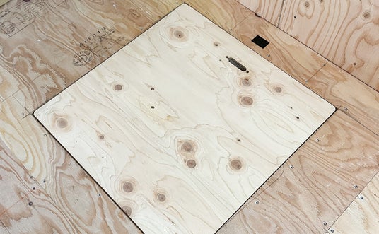 フタ部分の下地材を点検口まわりと同様の合板下地とすることで接着剤と釘またはステープルでの施工が可能となりました。