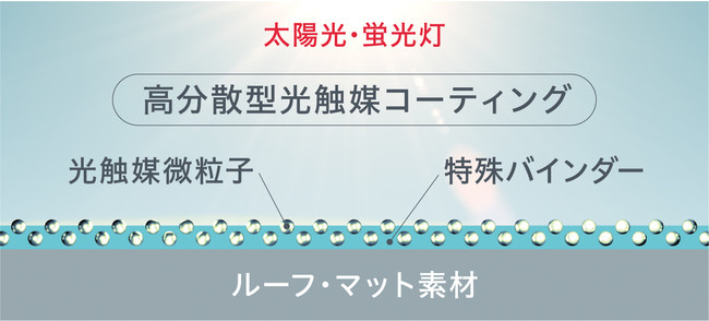 ニオイや雑菌の温床となりやすい天井やフロアに施工する「天井・カーマットコーティング」は、透明性が高く高強度の光触媒コーティング。新開発の特殊バインダーが光触媒微粒子を均一に分散して素材に密着し、車内に差し込む僅かな光で高効率な光触媒反応を実現、素材の見た目を損なわない透明性の高い光触媒コーティング被膜を形成します。