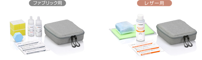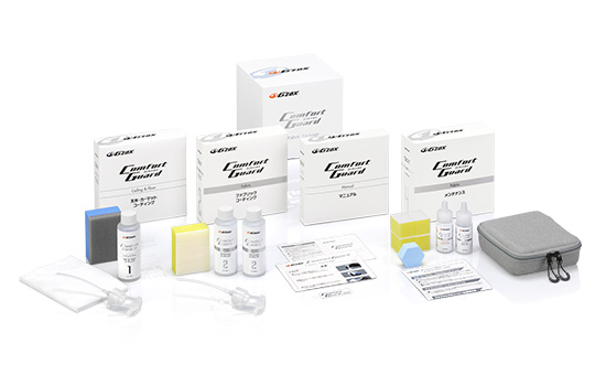 「G’ZOX コンフォートガード」を施工されたお客様のシートコーティングの効果が弱まってきた時、お客様ご自身で簡単にメンテナンスいただける専用セットをファブリック用、レザー用それぞれにご用意。コンパクトな専用ポーチに入って車内保管にも便利です。