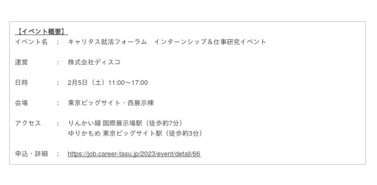 日付:2月5日(土) 会場:東京ビッグサイト・西展示棟 申込・詳細:https://job.career-tasu.jp/2023/event/detail/66/
