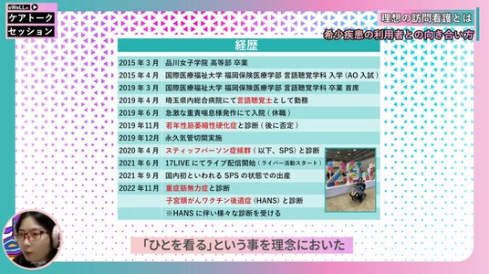 希少難病であるスティッフパーソン症候群や重症筋無力症など、子宮頸がんワクチン後遺症を伴う複数の重度疾患を抱え、訪問看護を受けている利用者でありながら、言語聴覚士の資格を持つ医療者でもある。