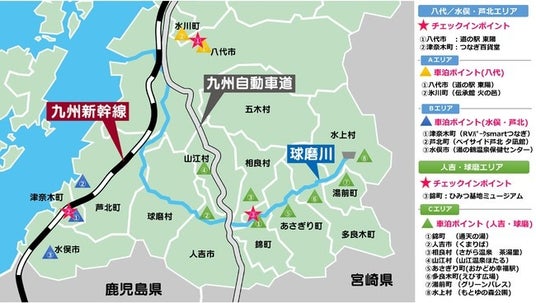 車泊ポイントは、人吉球磨地域に6ヶ所あり、2023年4月に県境の宮崎県西米良村に2ヵ所と、2023年12月に高鍋町に1ヶ所が開設され、今回の「RVパークsmart道の駅東陽せせらぎ」のオープンにより、下道で熊本県南~宮崎まで各車泊ポイントを1時間以内でつなぐ車泊周遊ルートが実現しました。今後は、熊本県南を経由して宮崎東海岸に向かうRVユーザーに八代市の「道の駅東陽」を起点とし、五木村→錦町→湯前町→西米良村→高鍋町の車泊周遊ルートを紹介していきます。