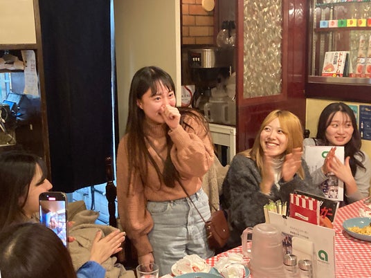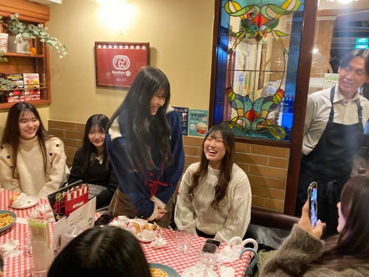 ドムドムハンバーガーPLUS銀座店にてゼミ生と集合写真