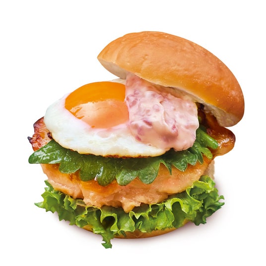 グリルチキンに目玉焼き、日本らしい食材である大葉と梅(梅タルタル)を合わせ、疲労回復が期待できるハンバーガーです。お仕事、学校生活、課題に追われ、日々疲れているアナタへ…!