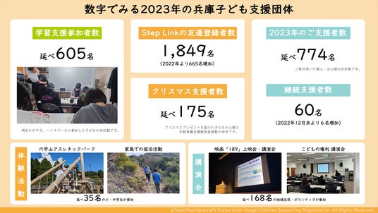 また、2023年はプロボノによる支援も受け、組織基盤を強化するための素地を育んだ1年となりました。当法人は、2023年1月には(公財)日本非営利組織評価センターが行なっている第三者評価制度において「グッドガバナンス認証団体」として認証を受け、2023年2月には認定NPO法人として、兵庫県より認定を受けました。ご支援頂いた寄付金などを有効活用するとともに、寄付金の使途を含めて積極的に情報公開や活動報告を行うことで、透明性ある法人運営を行ってまいります。