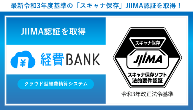 このたび当社の「経費BANK」が、大幅な改正を伴った令和3年度基準のJIIMA認証を取得したことで、お客様は電帳法要件を導入前に個別にチェックすることなく最新の法令基準を満たしたソフトとして安心して「経費BANK」をご利用いただけます。