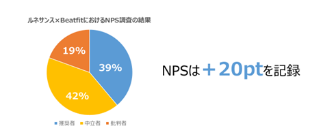 1年半にわたり、ルネサンス会員の中でBeatfitを利用したことのある方にアンケートを実施したところ、NPS(R)※で+20ptを記録し、ご利用者の顧客満足度が向上したことをお知らせします。