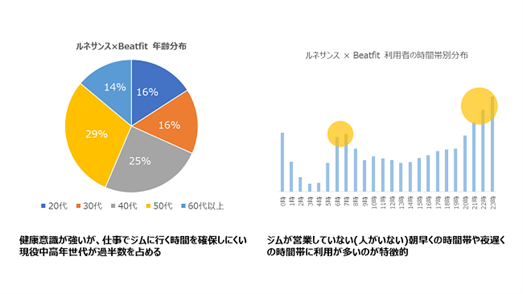 ルネサンス会員の中でBeatfit利用者の属性を分析したところ、40-50代の割合が過半数を占め、また利用時間は朝早く(6-7時)の時間帯と夜遅く(21-0時)の時間帯に集中する傾向が見受けられました。当社の分析では、仕事で忙しい健康意識の高い世代の方が、せっかくジムに入会したものの、ジムに通う時間を確保しにくい平日の仕事の前後にBeatfitをサポートツールとして活用しているものとみています。