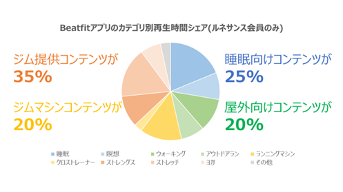 Beatfitでは、ランニング、ウォーキング、睡眠などの通常のスタジオレッスンにないジャンルのコンテンツを取り揃えています。ルネサンス会員のコンテンツの視聴割合を調査したところ、クラブ内でも提供しているコンテンツが全体の35%、クラブ内では提供していないコンテンツが65%となり、そのなかでも入眠向けのコンテンツが25%、屋外向けのコンテンツが20%と、スタジオレッスンにないコンテンツが過半数を占めました。