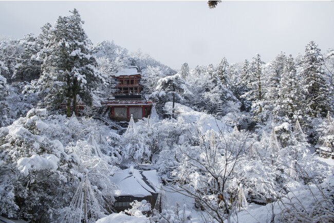 「ミシュラン・グリーンガイド・ジャポン」で1つ星の認定を受けた那谷寺は紅葉の時期だけではなく、冬の雪景色にも独特の美しさがあります。静寂な白銀の雪景色に真っすぐ伸びる参道境内には北陸独特の雪吊りが施されており、雪の狭間から見える緑が侘び寂びとした美しさを楽しむことができます。また、初詣では、金堂でのご参拝、本殿では胎内くぐりをして罪を流し、清らかな心で新年を迎えることができます。