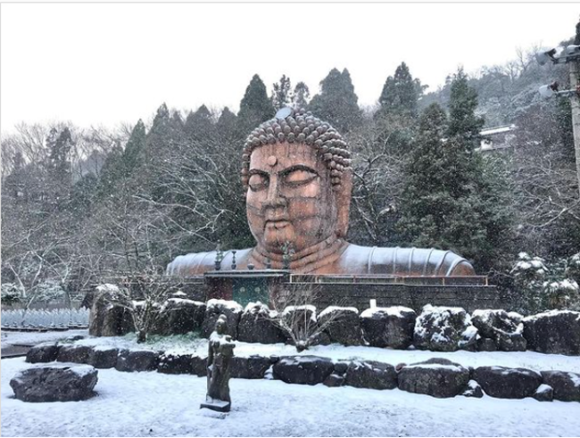ハニベ巌窟院は、かつて石切場だった洞窟内に開設した美術館で、入口の大きな仏頭が出迎えてくれます。洞窟の中には、『エンマ大王』『鬼の食卓』などさまざまな彫塑による地獄絵巻が繰り広げられており、洞窟を抜けると山頂には全長8mの釈迦涅槃像が横たわっています。冬には大頭に雪が積もりいつもと少し変わった大仏を見ることができます。