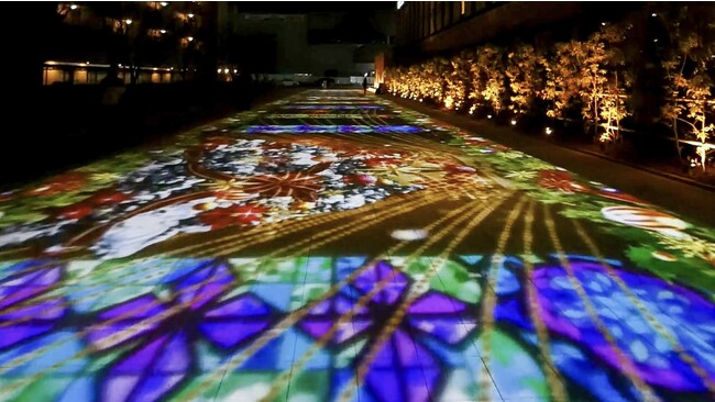 小松駅東口からサイエンスヒルズこまつまでのアプローチ「こまつ80スクエア」をプロジェクションマッピングで彩ります。日本海側最大級の常設プロジェクションマッピングとなっており、毎日、日没から21時まで四季折々の演出を楽しむことができます。