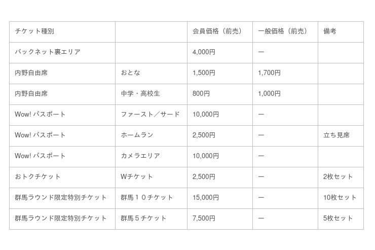 ※バックネット裏エリア、Wow! パスポートシートは、開催ラウンドによって取扱状況が異なります。予めご了承ください。