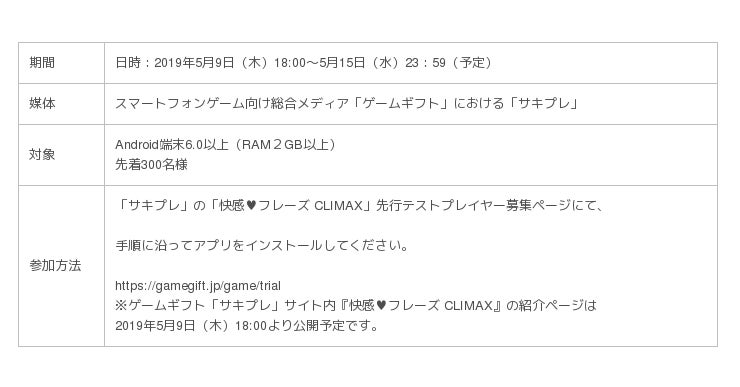 GMOインターネット株式会社は、現在開発中の新作ゲームアプリ『快感(ハート)フレーズ CLIMAX』のクローズドベータテストを2019年5月9日(木)18時より、スマートフォンゲーム向け総合メディア「ゲームギフト」で実施いたします。