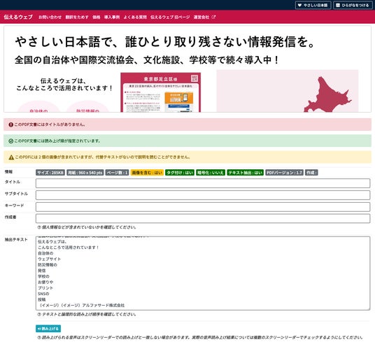 アルファサード株式会社は、無料で PDF のアクセシビリティを自動チェックするオンラインツール「伝えるPDF」をリリースしました。また、チェック後に、最適な音声読み上げ PDF に改善する新サービスを開始いたします。