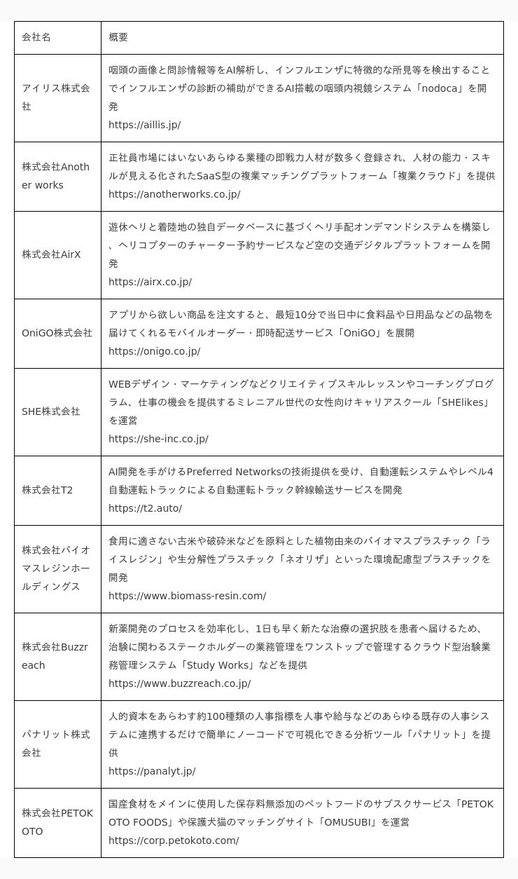 ファイナリスト10社は以下の通りです。(掲載はあいうえお順)