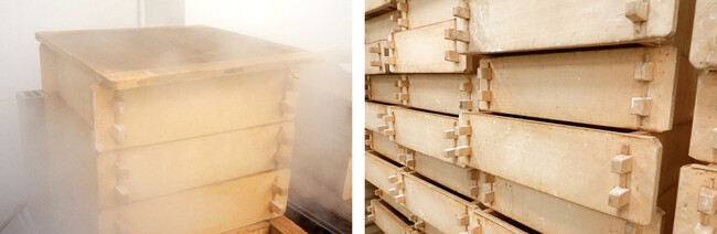 職人が丹念に炊き上げた「あん」をくるんで形を整えたら、昔ながらの蒸籠(せいろ)に並べて、強い蒸気で蒸し上げます。ふっくらまろやか、しっとりと美味しい薯蕷饅頭の出来上がり。「栗まろ」では蒸し上がったお饅頭のてっぺんに、可愛らしい栗の形の焼印を入れて、完成となります。