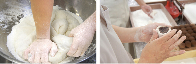 薯蕷(じょうよ)とは山の芋のこと。 京都では上用(じょうよう)饅頭とも呼ばれ、古くから婚礼の引出物や お配り饅頭他、各種お祝いに使われます。 鶴屋吉信の薯蕷饅頭は、丹波産の上質なつくね芋をすりおろし、砂糖と上用粉(お米の粉)を加えて手早く、力強くこね上げた生地を使用します。よく揉みこねることで、コシと弾力のある薯蕷生地ができあがります。