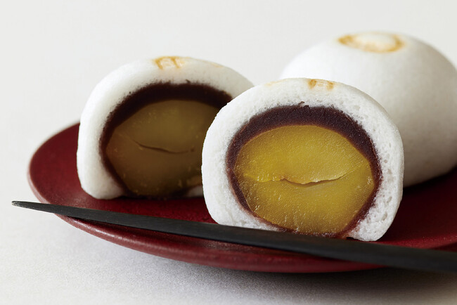 丹波産のつくね芋からつくる薯蕷(じょうよ)生地で、ほくほく甘い蜜漬けの栗をまるごと1個、なめらかなこしあんとともに職人の手でやさしく包み、昔ながらの蒸籠で蒸し上げた薯蕷饅頭。秋のおとずれを告げる銘菓として、長年ご愛顧いただいております。