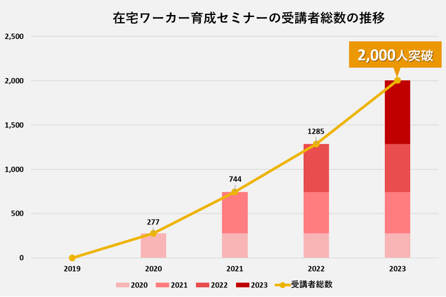 2020年から提供を開始した「在宅ワーカー育成セミナー」は、自治体からの依頼が年々増えており、3年目には受講者数1,000人を達成。4年目となる今年度(2023年)、2,000人を突破しました。
