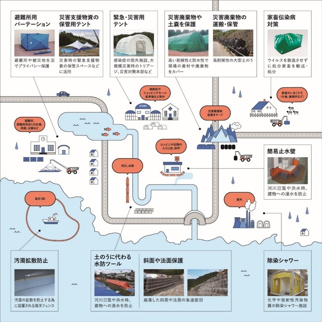 大規模な災害に備え、関係機関相互の協力体制を強化し、防災意識の高揚を図るために山形県・天童市合同総合防災訓練が開催されます。この訓練では、マク・クイックシェルター1張りを展示するほか、ゲリラ豪雨などが発生して建物への浸水が予想される際に、水の浸入部を構造的にも安定した三角断面の膜構造体で帯状にガードして被害を抑制する水防ツール「デルタパネル」も展示します。