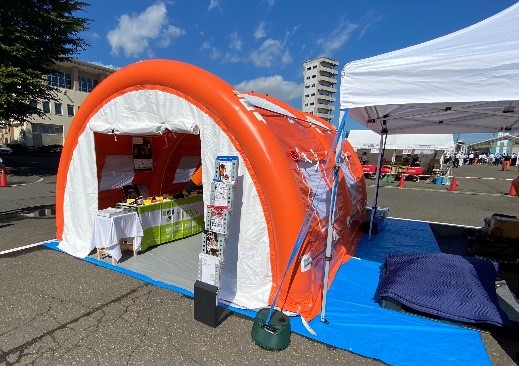 日本全国から選び抜かれた消防隊員達が一堂に会し、日頃鍛え抜いた消防救助技術を競い合う「第51回全国消防救助技術大会 in 札幌」は、陸上の部(8種目)、水上の部(8種目)に分かれて開催されました。この会場にマク・クイックシェルター1張りを展示しました。マク・クイックシェルターは、緊急・災害時に素早く簡単に設営できるハイブリッドエアテントです。女性4人で10~15分で設営が可能です。災害対策本部や救護所をはじめとする幅広い用途に即応力を発揮します。東日本大震災などの災害時に医療用途などを含めて過去に2700張以上の活用実績があります。