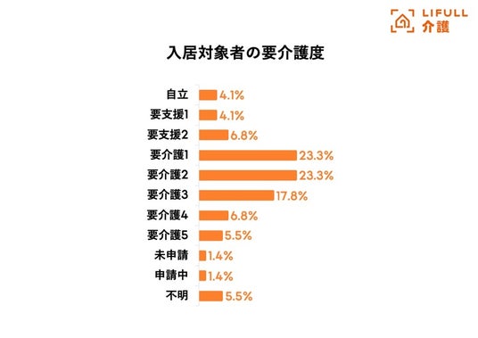 入居対象者の要介護度を集計したところ、要介護1、2がそれぞれ20%を超えて上位となっていました。