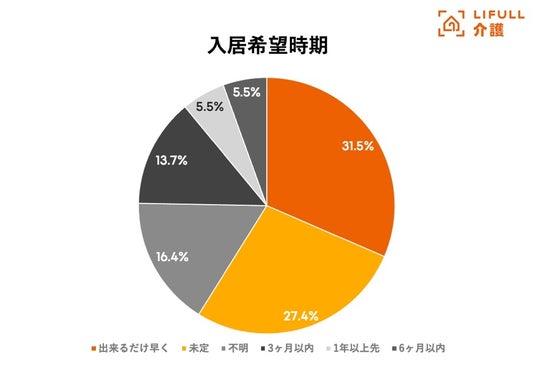 続いて希望の入居時期の傾向をまとめたところ、「できるだけ早く」が31.5%と最多でした。対象者の多くが「独居」だった前項のデータと合わせると、一人暮らしでご本人以外に施設入居について判断や調整を行う方がいない場合、限界を迎えるまでご自宅で暮らしている場合が多いと推察されます。緊急性が高まったタイミングで、ケアマネジャーが介護施設の入居のサポートを実施するようです。