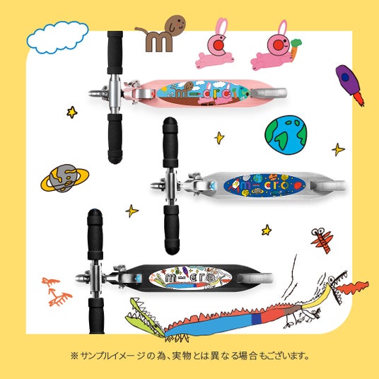 今回、ぬり絵コンテストの当選者第1位は、マイクロのブランドロゴを動物に見立てたデザインや、宇宙やワニでユニークに世界観を表現した作品が当選されました。見事第1位に選ばれた当選作品は、マイクロスクーターの人気商品である2輪タイプの子供用キックボード「マイクロスプライトLED」へぬり絵作品をデザインし、世界でたった一つ自分だけのオリジナルキックボードとして当選したお子様へプレゼントされる予定です。