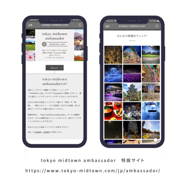 東京ミッドタウン、東京ミッドタウン日比谷では「#midtown_amb」をつけて Instagramに投稿をすると、誰でも東京ミッドタウンのアンバサダーになれる取り組みを実施しています。そして「#midtown_amb」がついたInstagram上の投稿を「visumo social」で収集・掲載。アンバサダーお気に入りの東京ミッドタウンの「場所」や「時間」、「隠れスポット」などを投稿していただくことで、東京ミッドタウンの魅力をより多くのお客様に発信するような施策となっています。