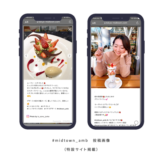 東京ミッドタウンでは期間限定の投稿キャンペーンも実施。過去に実施した「TOKYO MIDTOWN The Strawberry」投稿キャンペーンでは「#midtown_amb」「#いちご」で投稿したユーザーの中から受賞作品が選ばれ、東京ミッドタウンから賞品が送られました。季節のイベントなどと絡めた投稿キャンペーンを実施することで、Instagram投稿をきっかけとした施設訪問の動機づけや、より一層の施設利用の促進が期待できます。visumoでは複数のハッシュタグでの投稿収集も可能かつデザインについても柔軟なカスタマイズが可能なため、イベント的に投稿キャンペーンを実施する際にもご活用いただけます。
