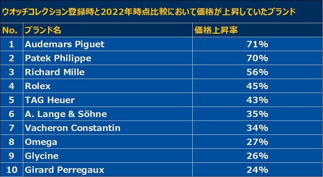 今回はユーザーがウォッチコレクションに時計を登録した時点と2022年時点とを比較し、価格上昇率が高かったブランドを発表いたします。