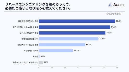 リバースエンジニアリングを進めるうえで必要だと感じる取り組みについて尋ねたところ、「設計書の自動生成・更新」が58.2%で最も多く、「属人化を防ぐドキュメント整備」が54.5%、「システム構造の可視化」が50.9%と続き、最新の状態を維持可能な仕組みづくりへの期待が高いことがわかりました(n=165/事業会社)。