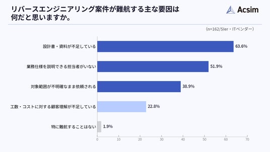 リバースエンジニアリング案件が難航する主な要因を尋ねたところ、「設計書・資料が不足している」が63.6%で最も多く、「業務仕様を説明できる担当者がいない」が51.9%、「対象範囲が不明確なまま依頼される」が38.9%と続きました(n=162/SIer・ITベンダー)。