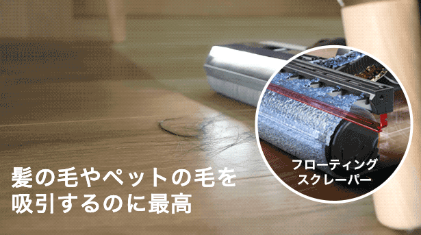 ローラーブラシにフローティングスクレーパーを搭載。ブラシに圧力をかけながらゴミや髪の毛をこすり落とすため、ローラーブラシにゴミや髪の毛がくっつきにくくなっています。吸引口に毛が絡む問題は過去のこと。手入れの手間も大幅に削減され、気持ちよく掃除することができます。