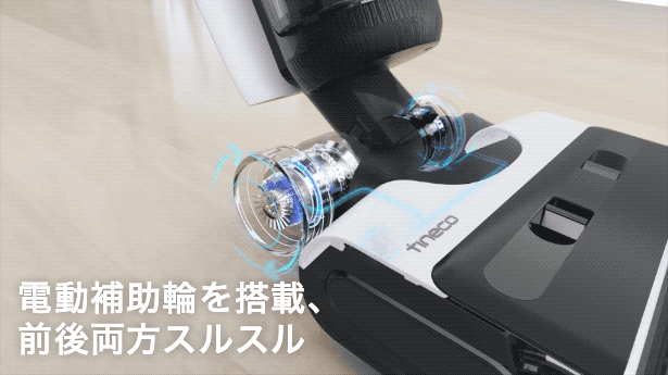 水タンクを装着した掃除機はどうしても重くなりがちですが、Tineco FLOOR ONE S7には、電動補助輪が搭載されているため、力を入れなくてもスイスイ掃除することができます。さらに、走行方向を自動的に感知するため、前進だけでなく後退時にも掃除が楽々に行えます。