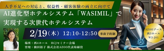 会期中、弊社代表取締役の横田裕子が登壇するセミナーでは、AI進化型ホテルシステム「WASIMIL」が実現する次世代のホテル運営について、具体的な事例を交えながら解説します。