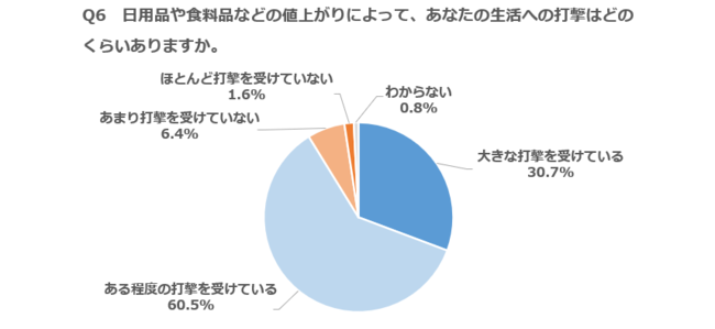 食料品や電気代などの値上がりで「大きな」「ある程度の」打撃を受けている人は計91%で、昨年5月調査より16ポイント増となった。