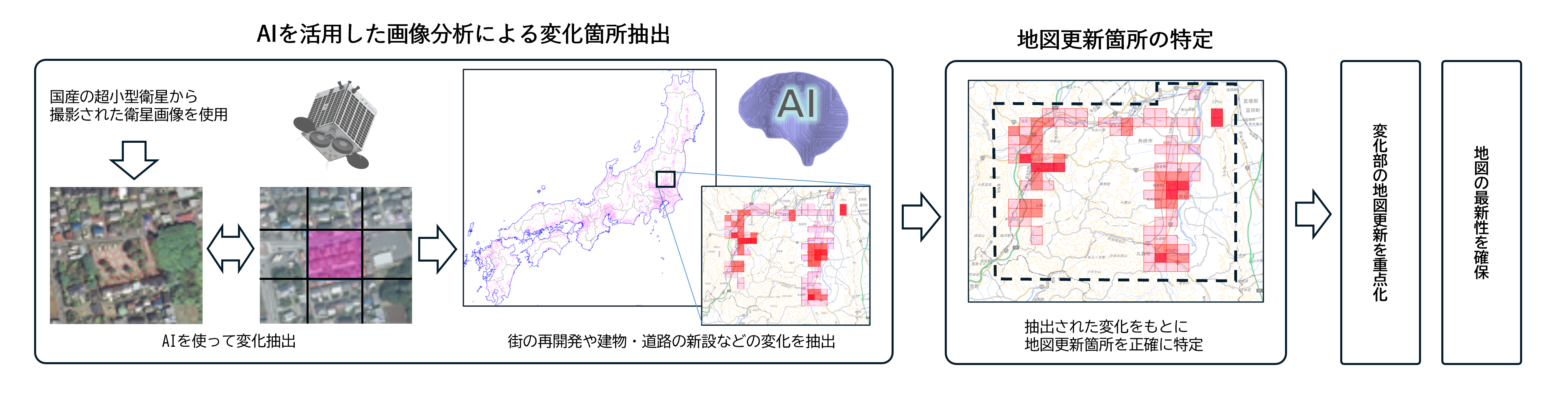 電子国土基本図とは、日本の国土を統一規格で表すために国土地理院が作成するデジタル形式の基本図です。カーナビゲーションシステムや地図アプリ、そしてハザードマップなど、民間・行政のあらゆる地図の基礎として活用されており、電子国土基本図の整備・更新と活用促進は、政府における重要施策の一つに位置付けられています。同院では、これらの活動の生産性向上を目的として、二つの異なる時期に撮影された衛星画像とAIによる画像分析から、変化部を抽出する技術の開発とシステム構築を進めてきました。