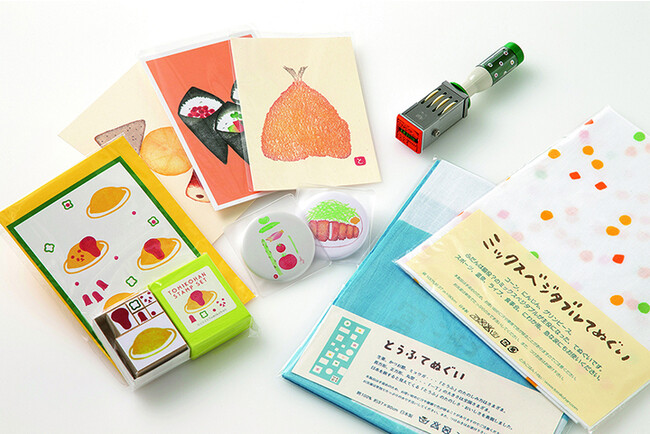 「ロフコト雑貨店」を紹介する小冊子の表紙を飾った、消しゴムはんこで描いたかわいらしいおにぎり。そのイラストを描いた「とみこはん」の文房具や手ぬぐい、表紙に使われたおにぎり柄のポストカードなど、とみこはんグッズを販売します。さらに、とみこはんによるワークショップを各店舗で開催します。