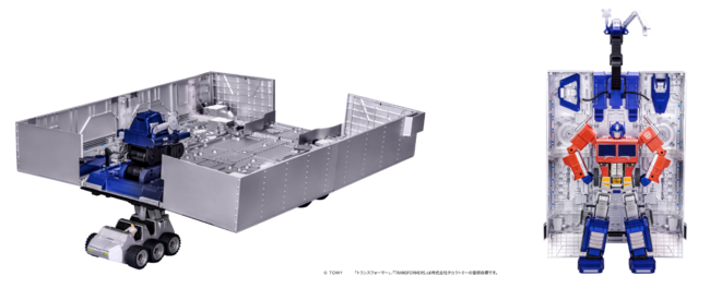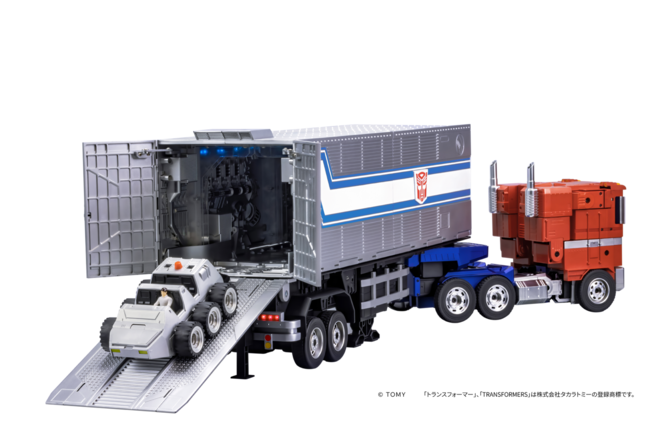 株式会社タカラトミー完全監修のもと、2000を超えるパーツで構成されたトレーラーはG1のレガシーな外観をリアルに再現。「フラッグシップオプティマスプライム」と「トレーラーセット」を繋げた全長は約93cmの圧倒的なサイズで、さらに60個のマイクロチップと今回のために開発されたパワフルな18個のサーボモーターがダイナミックな変形を実現します。